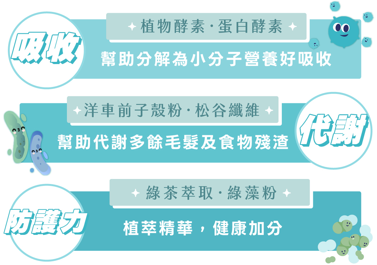 ✓綠茶×綠藻胺基酸,抗氧化、糞便氣味不惱人