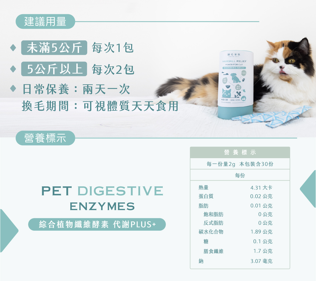 ✓洋車前子殼粉,排出腸道毛髮和代謝廢物