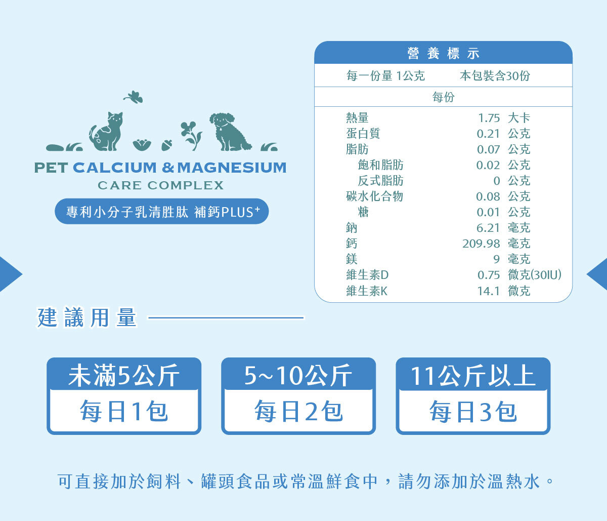 可直接加於飼料、罐頭食品或常溫鮮食中,請勿添加於熱水